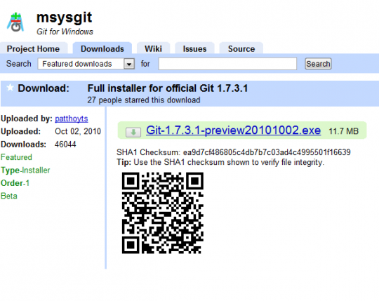 Grab the latest version of Git. I went with v1.7.3.2. The installer was pretty painless and just involved clicking through the options.