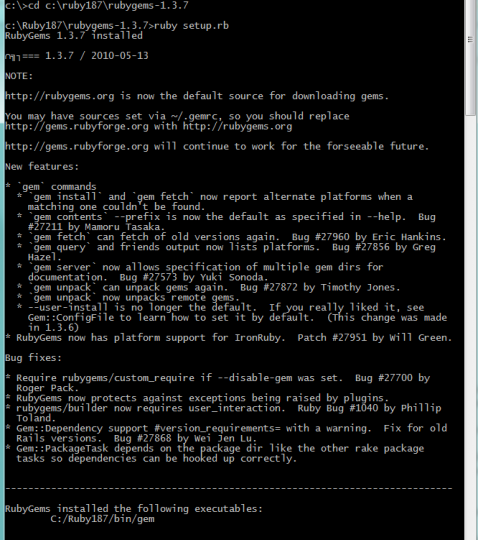 Open up the command line and navigate to your “rubygems-1.3.7” folder. To change directory, type in “cd” followed by the location. In my screenshot, I typed in “cd C:/ruby187/rubygems-1.3.7/” since the location of my “setup.rb” file was in C:/ruby187/rubygems-1.3.7/